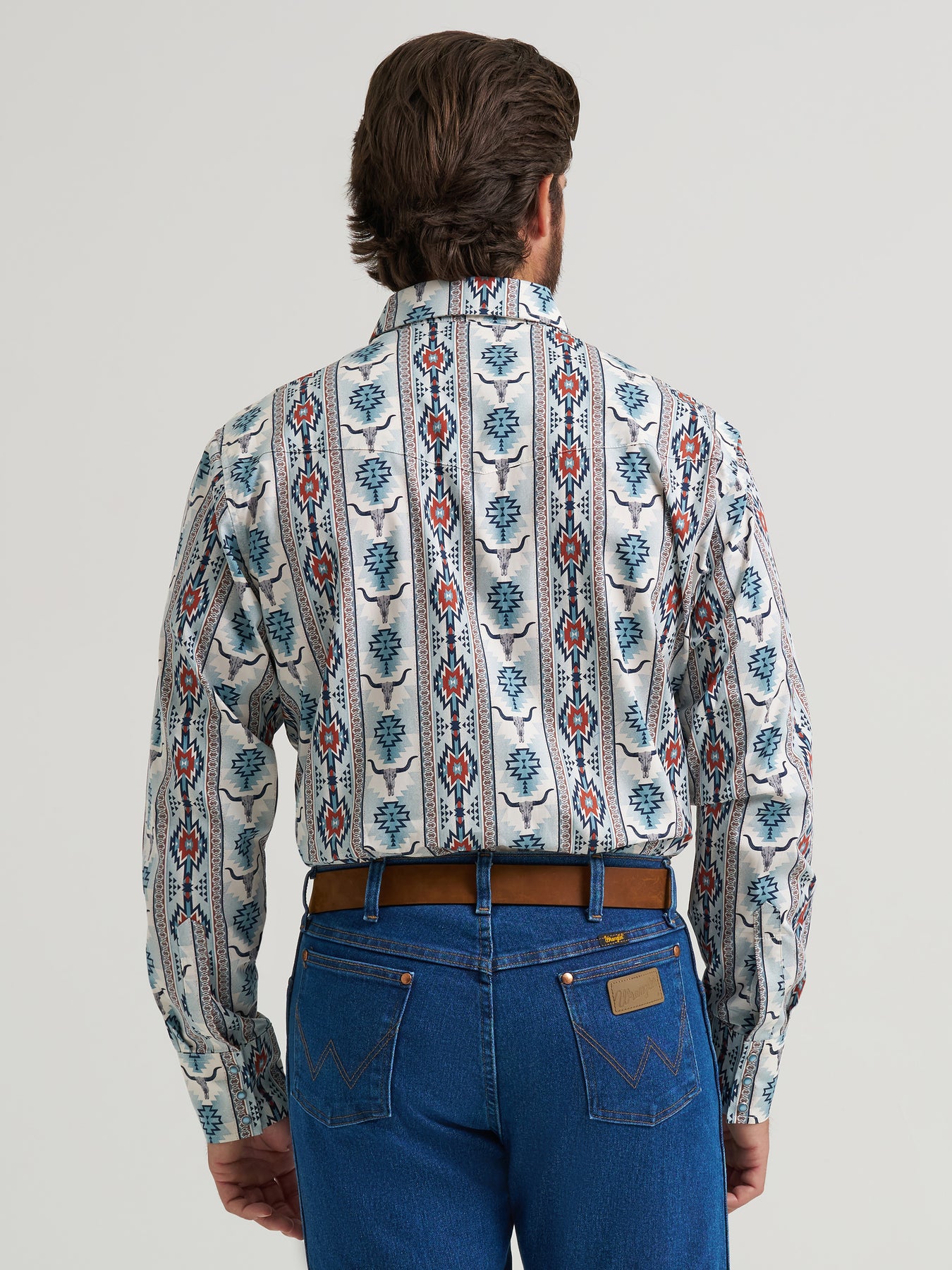 Wrangler's Checotah has a home in the closets of cowboys around the world. This men's Checotah long-sleeve western snap Navajo-inspired printed shirt is designed to make a statement no matter the destination. It features a classic fit, a spread collar, pointed yokes, two snap flap pockets with a convenient pencil slot, adjustable cuffs, and a full-length snap closure for the finishing touch. Best of all, it's crafted from cotton for uncompromising comfort. Look sharp at a moment's notice by wearing your Checotah shirt with a Wrangler Retro or Cowboy Cut jean.
